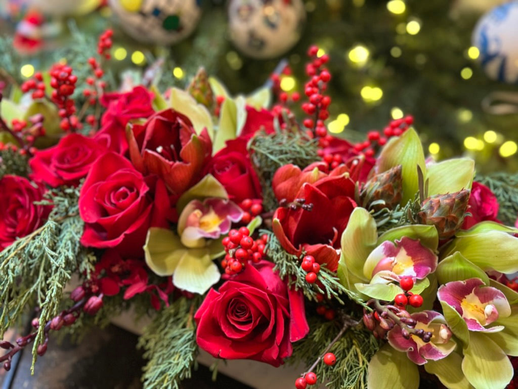 A festive and lush arrangement designed to bring warmth, texture, and seasonal elegance to any holiday setting. Available in three styles to suit a variety of tables and event layouts. Each design is composed with natural movement and fullness using fragrant evergreens, winter blooms, and refined seasonal accents.
